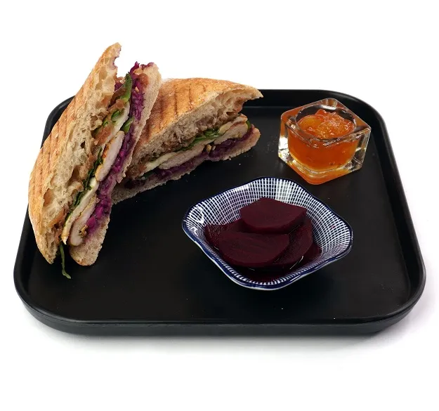 نان چاباتا + دو عدد فیله مرغ + پنیر موزارلا + سالاد کلم و سس دیژون + مربا پیاز